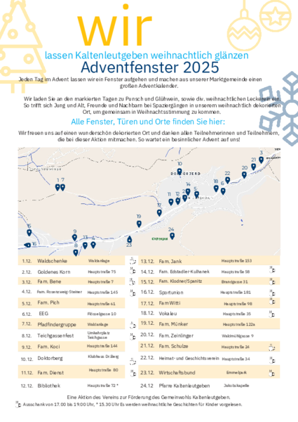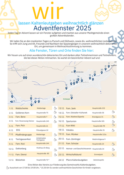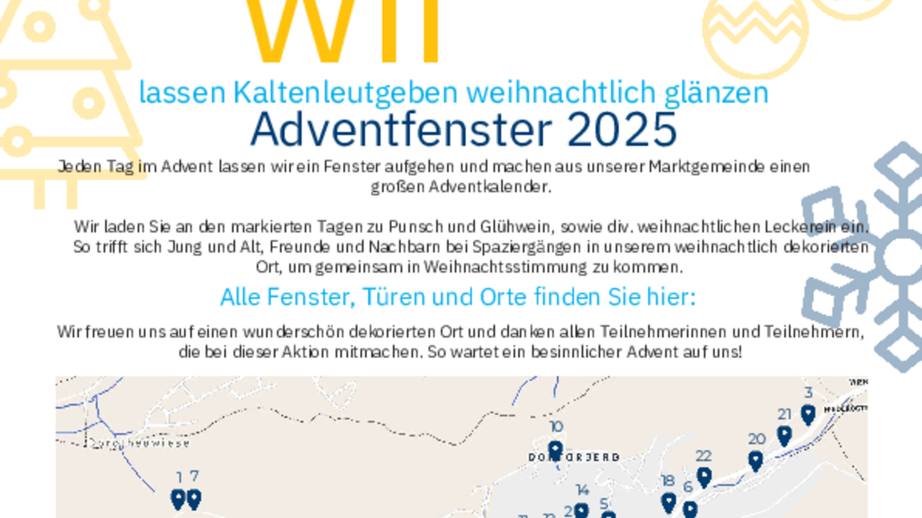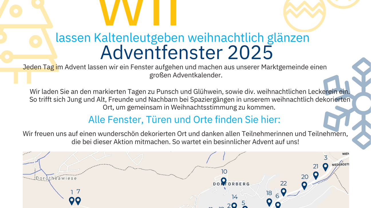 In Kaltenleutgeben wird auch heuer wieder die schöne Tradition der Adventfenster fortgesetzt. Ab dem 1. Dezember öffnet sich jeden Abend ein liebevoll gestaltetes Fenster, das den Ort Schritt für Schritt in festlichen Glanz taucht. Familien, Vereine und Betriebe beteiligen sich mit viel Kreativität und laden dazu ein, den Advent gemeinsam zu erleben. Die beleuchteten Fenster können beim Spaziergang durch den Ort entdeckt werden und bringen Wärme, Licht und Zusammenhalt in die Vorweihnachtszeit.